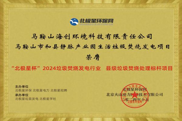 馬鞍山海創(chuàng )榮膺“北極星杯”2024垃圾焚燒發(fā)電行業(yè) 縣級垃圾焚燒處理標桿項目