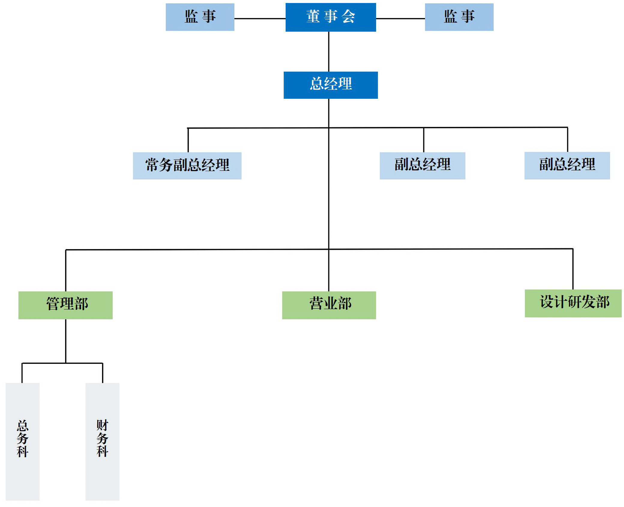 ?公司下設:管理部、財務(wù)部、營(yíng)業(yè)部、海外營(yíng)業(yè)部、品質(zhì)部、采購部、工程部、設計部共8個(gè)部門(mén)。