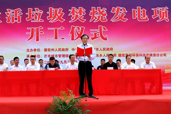 9點(diǎn)30分,儀式正式開(kāi)始,海螺創(chuàng )業(yè)總經(jīng)理紀勤應代表海螺創(chuàng )業(yè)致辭。他首先向前來(lái)參會(huì )的各級政府領(lǐng)導、來(lái)賓表示衷心感謝,并向大家介紹了德宏海創(chuàng )的基本情況。他指出,芒市生活垃圾發(fā)電項目是由中國海螺創(chuàng )業(yè)控股有限公司投資建設,建成投產(chǎn)后能徹底解決芒市生活垃圾圍城的困擾,實(shí)現垃圾的“減量化、無(wú)害化、資源化”。他要求,項目公司要“不忘初心,牢記使命”,按習總書(shū)記“綠水青山就是金山銀山”的綠色發(fā)展觀(guān)念,扎實(shí)推進(jìn)項目建設,把項目建設好、運營(yíng)好,打造成德宏州對外的窗口和名片,成為芒市的工業(yè)旅游點(diǎn)和環(huán)保教育基地,切實(shí)履行好大企業(yè)的社會(huì )責任,為芒市的生態(tài)文明建設貢獻力量。