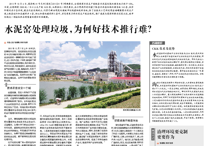 ????貴州省副省長(cháng)幕德貴在貴定海螺盤(pán)江水泥有限責任公司的水泥窯協(xié)同處置城市生活垃圾專(zhuān)案現場(chǎng)推廣會(huì )指出,推廣運用這一技術(shù)不僅可以徹底根除城市垃圾處理頑癥,而且“一是可以充分利用現有的廠(chǎng)址和部分輔助設施,節約工程投資。二是在處理了垃圾的同時(shí)生產(chǎn)了水泥,創(chuàng )造了新的經(jīng)濟效益。三是通過(guò)推廣水泥窯協(xié)同技術(shù),實(shí)現對垃圾資源的利用,促進(jìn)了環(huán)保設施的產(chǎn)業(yè)化,推進(jìn)環(huán)保產(chǎn)業(yè)加快發(fā)展?!蓖瑫r(shí),幕德貴在關(guān)於技術(shù)推廣的落實(shí)上強調:“定路線(xiàn)圖,定工作量,定時(shí)間表,定責任人”真正把這項工作落到實(shí)處,全力保護貴州省寶貴的環(huán)境資源。隨後,海螺水泥向貴州省起草了一份詳盡的推廣建議和整體方案。