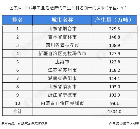 ? ? 從地區上來(lái)看,2017年工業(yè)危廢排名前十的城市共計產(chǎn)生工業(yè)危廢1304萬(wàn)噸,占全部信息發(fā)布城市產(chǎn)生總量的32.5%。排名前三的分別為山東省煙臺市、吉林省吉林市和四川省攀枝花市,產(chǎn)生量分別為229.3萬(wàn)噸、148.8和138.9萬(wàn)噸。與一般工業(yè)固廢不同的是,山東省工業(yè)危廢產(chǎn)生量較多,在前十城市中占據兩席;西部地區入榜反而較少,主要原因為西部工業(yè)以一般工業(yè)為主,沿海地區工業(yè)結構偏向高端制造。