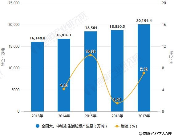 2013-2017年全國大、中城市生活垃圾產(chǎn)生量統計及增長(cháng)情況