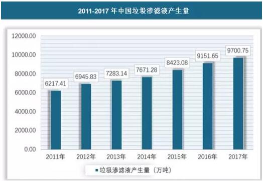 ? ? 此外,有關(guān)數據顯示,2017年我國日均垃圾滲濾液產(chǎn)生量為26.57萬(wàn)噸,全年垃圾滲濾液產(chǎn)生量達到9700.75萬(wàn)噸,較上年增長(cháng)549.1萬(wàn)噸,同比增長(cháng)6%。