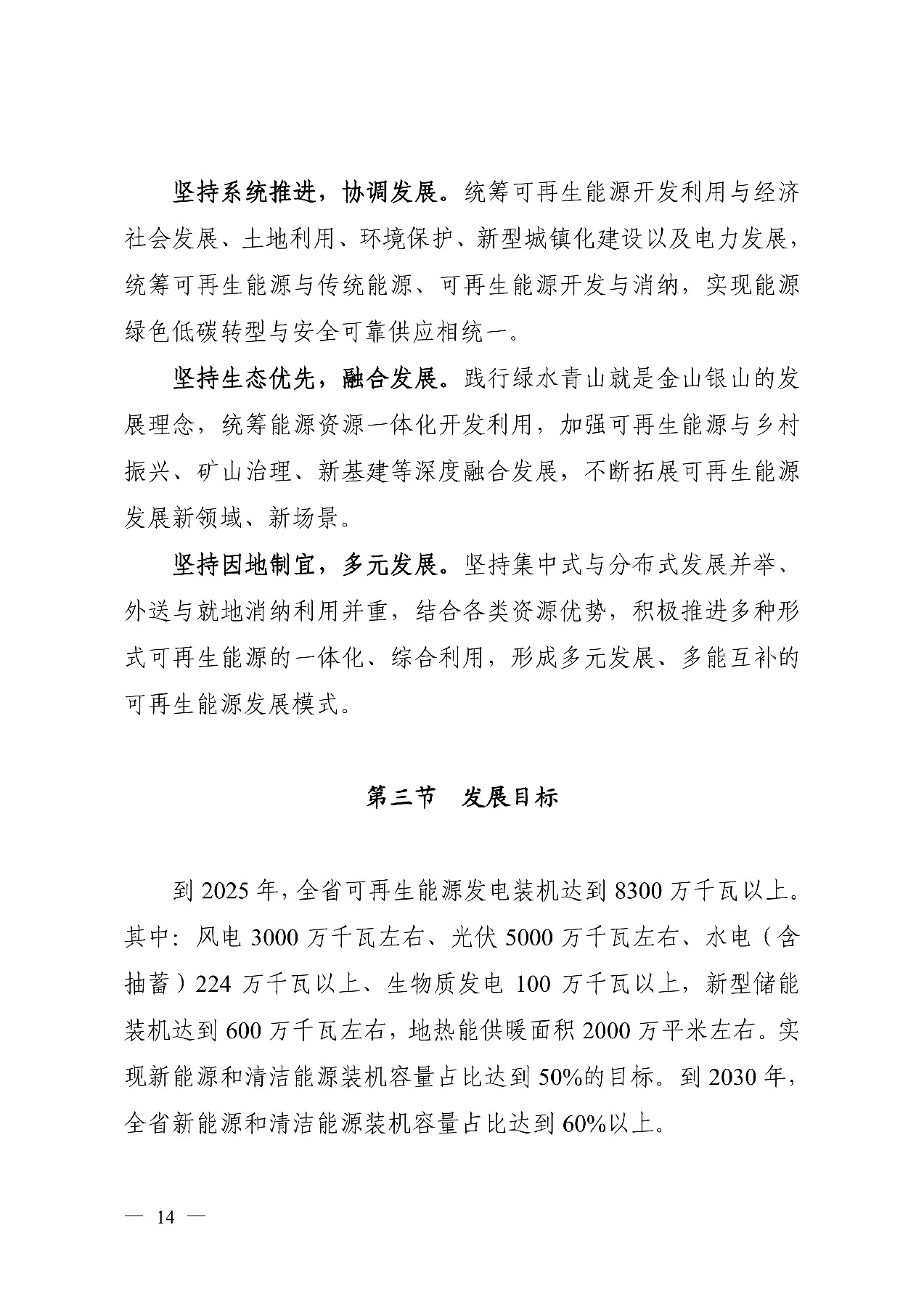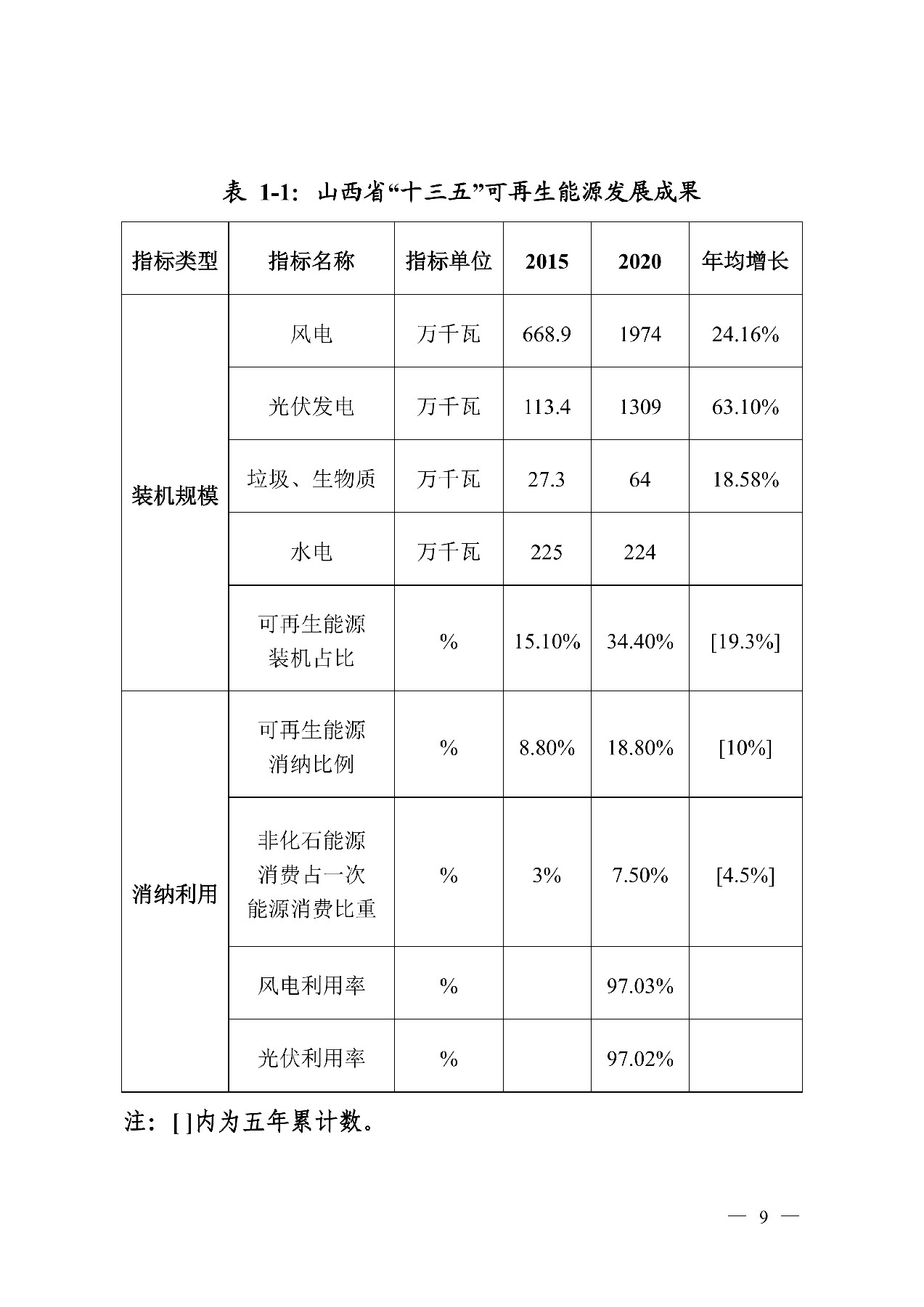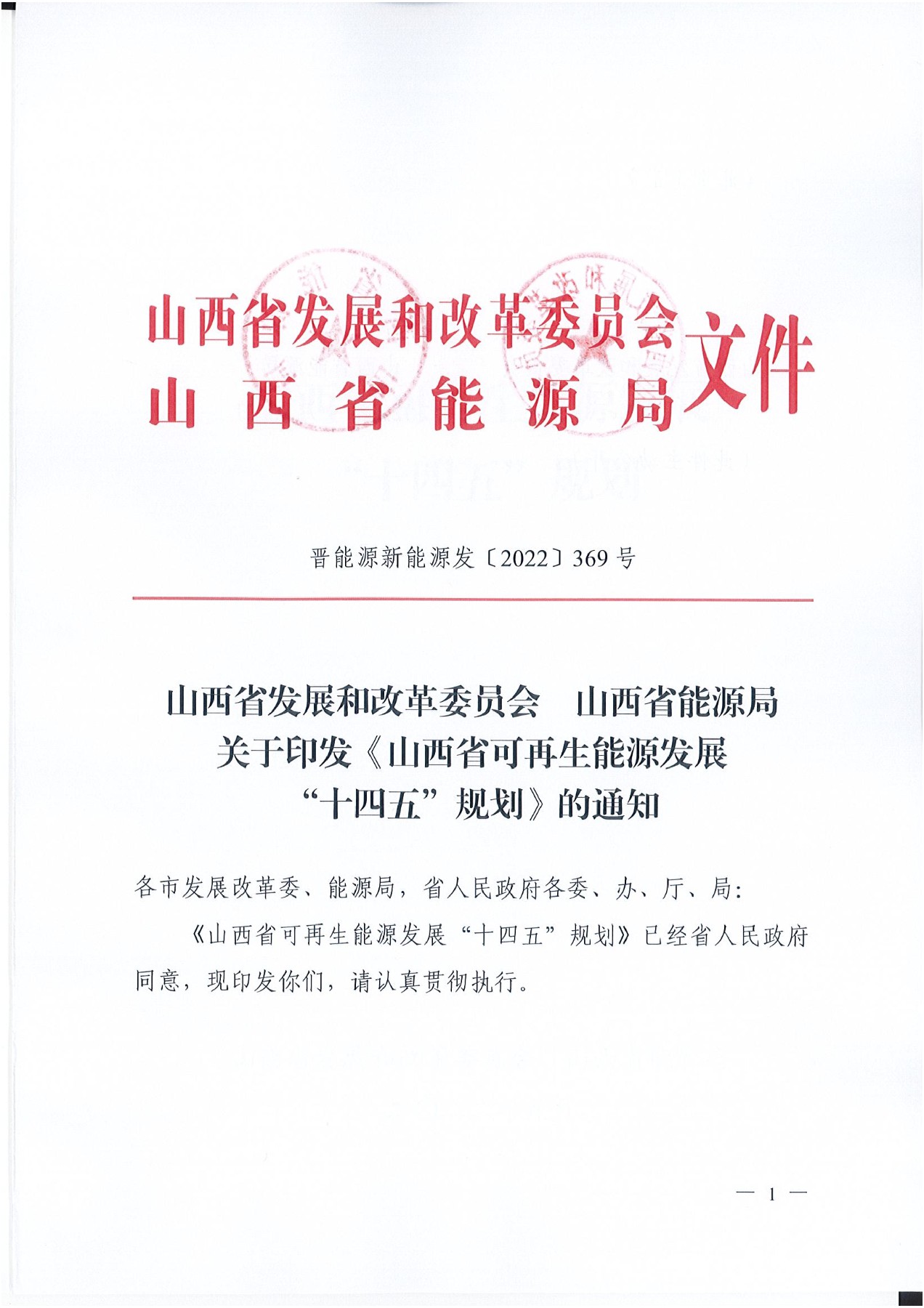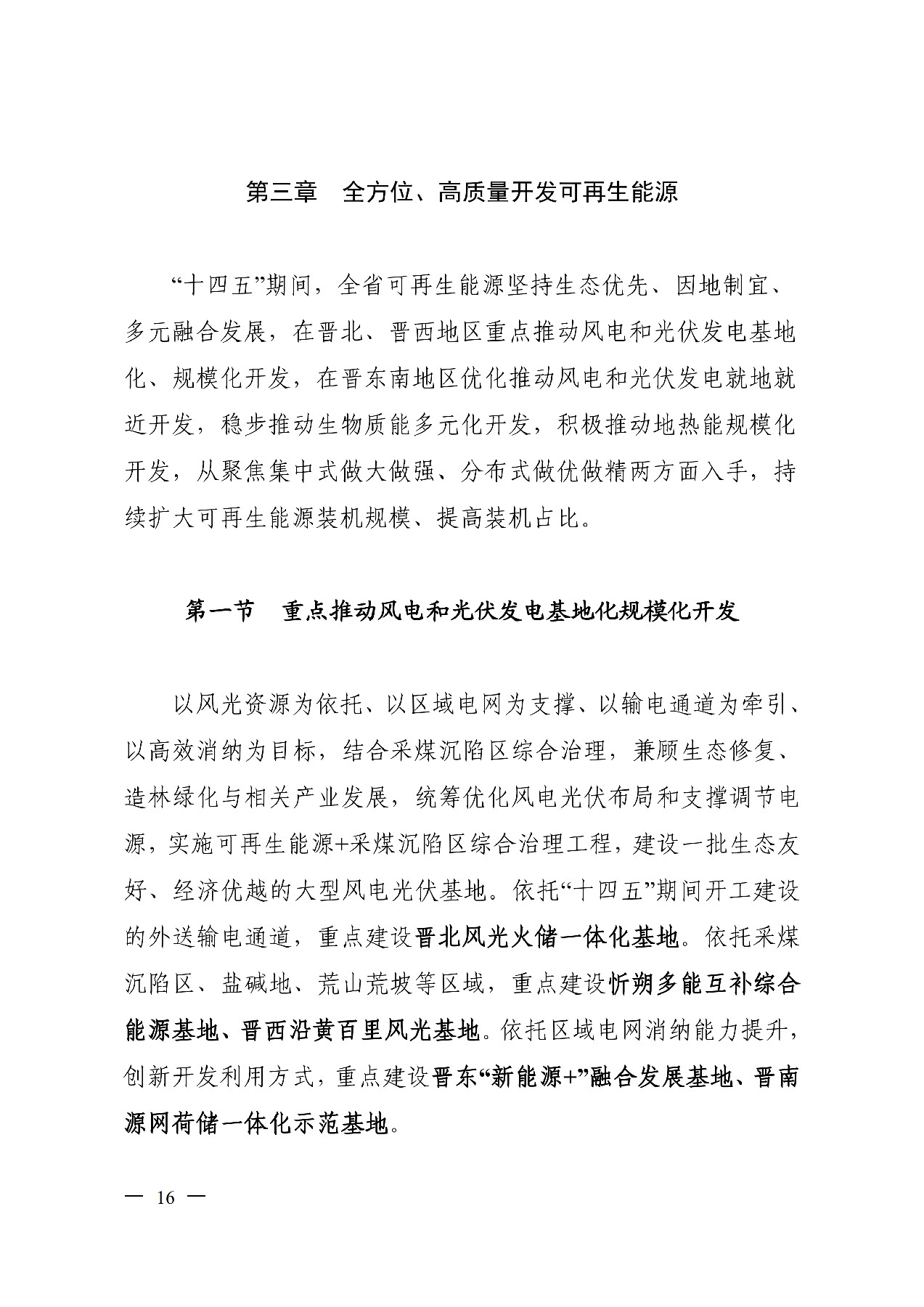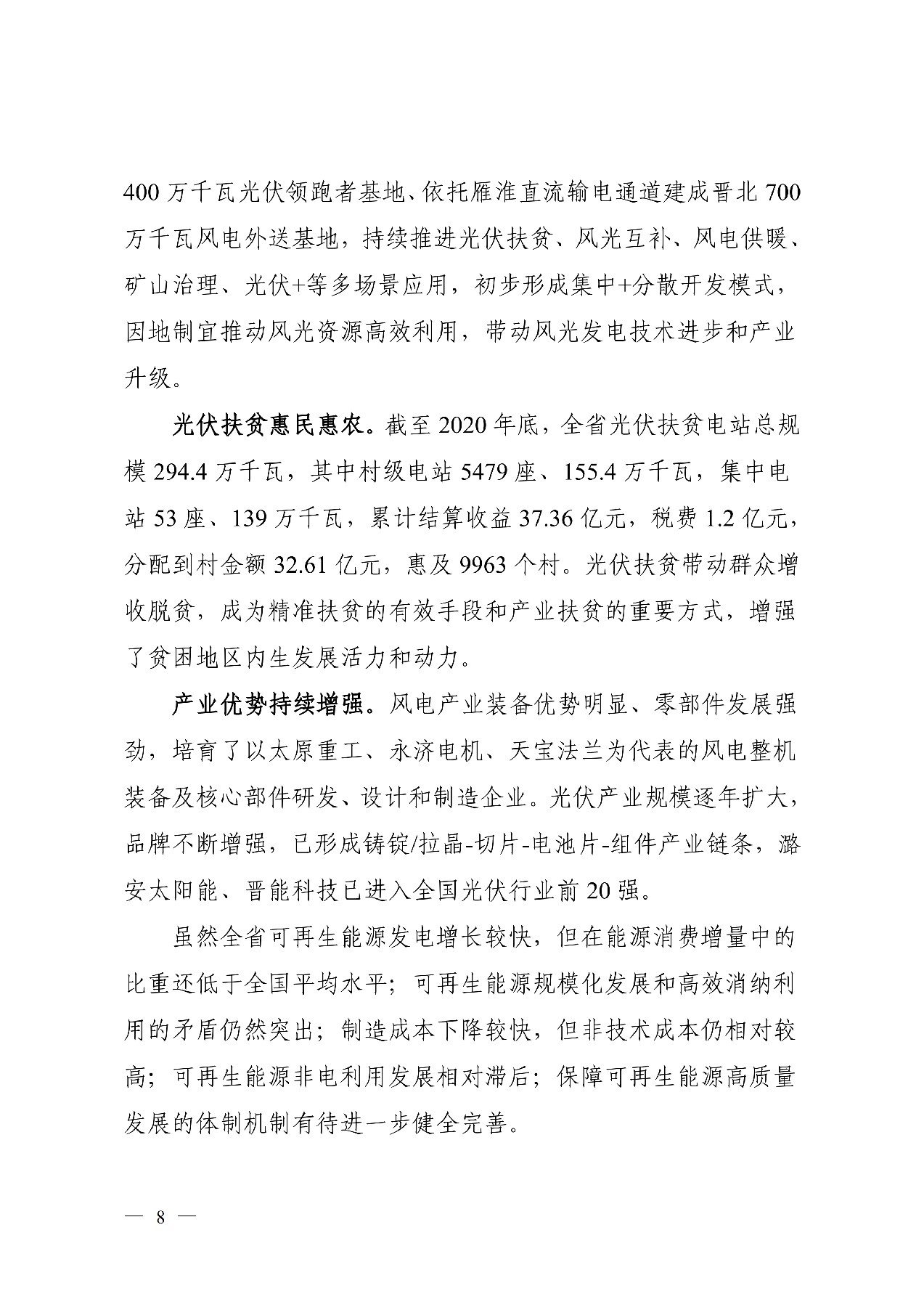 10月8日,山西省發(fā)展和改革委員會(huì )山西省能源局印發(fā)《山西省可再生能源發(fā)展”十四五“規劃》?!兑巹潯诽岢?,到2025年,全省可再生能源發(fā)電裝機達到8300萬(wàn)千瓦以上。 其中,風(fēng)電3000萬(wàn)千瓦左右、光伏5000萬(wàn)千瓦左右、水電(含抽蓄)224萬(wàn)千瓦以上、生物質(zhì)發(fā)電100萬(wàn)千瓦以上,新型儲能裝機將達到600萬(wàn)千瓦左右,實(shí)現新能源和清潔能源裝機容量占比達到50%的目標。到2030年,全省新能源和清潔能源裝機容量占比達到 60%以上。