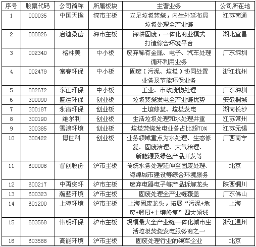 ? ? 在環(huán)保各子行業(yè)中,固廢處理行業(yè)具有投入大、周期長(cháng)、回報穩定的特點(diǎn)。本人對A股16家固廢處理行業(yè)上市公司進(jìn)行了整理,具體公司情況如下表:
