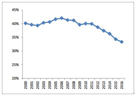 ? ? 環(huán)保投資結構不甚合理,工業(yè)污染治理投資總額增長(cháng)明顯但占比偏低,與工業(yè)發(fā)展階段相背離。我國工業(yè)仍處于快速發(fā)展階段,2000年以來(lái)占GDP的比重一直維持在30%以上的高位,而工業(yè)污染治理投資總額占全國環(huán)境污染治理投資總額的比例自2000年的高點(diǎn)之后卻呈現快速下降及明顯波動(dòng)的趨勢。2000年工業(yè)污染治理完成投資總額234.79億元,占全國環(huán)境污染治理投資總額的23.1%,而到2016年,工業(yè)污染治理完成投資總額819億元,但占比已經(jīng)降至8.9%。這一數據表明,在投資拉動(dòng)經(jīng)濟增長(cháng)的背景下,以政府支出為主的城市環(huán)境基礎設施建設投資在一定程度上擠占了工業(yè)污染治理投資,對污染物排放占比大的工業(yè)企業(yè)污染治理投入不足,從而加大環(huán)境目標達成的難度。