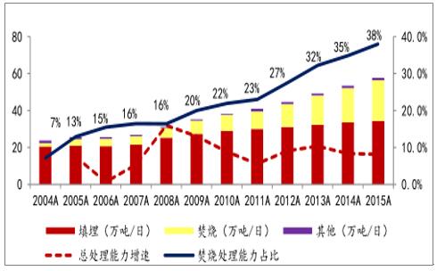 ? ? 2004年以來(lái),我國生活垃圾處理能力穩步提升,其中大部分增量來(lái)自于焚燒處理。焚燒處理能力占比由2004年的7%增長(cháng)至2015年的38%。我國2020年末生活垃圾焚燒處理能力需要從2015年末的23.52萬(wàn)噸/日增長(cháng)至59.41萬(wàn)噸/日。焚燒所占總垃圾處理能力的比例由2015年的31%上升至2020年的54%。假設處理能力每年增量相同,則2016-2020年每年需要增加7.18萬(wàn)噸/日的垃圾焚燒處理能力。