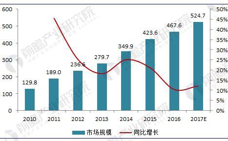 圖表2:2010-2017年我國污泥處理市場(chǎng)規模變化趨勢圖(單位:億元,%)