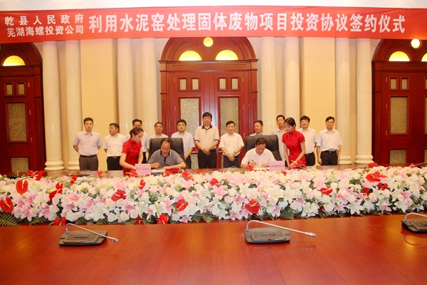 ??? 8月7日下午,乾縣人民政府、蕪湖海螺投資公司在海螺國際會(huì )議中心六樓東海廳正式簽署了在乾縣建設利用水泥窯處理固體廢物項目投資協(xié)議,茍曉瑜、紀勤應分別代表乾縣政府、蕪湖海螺投資公司在投資協(xié)議上簽字。