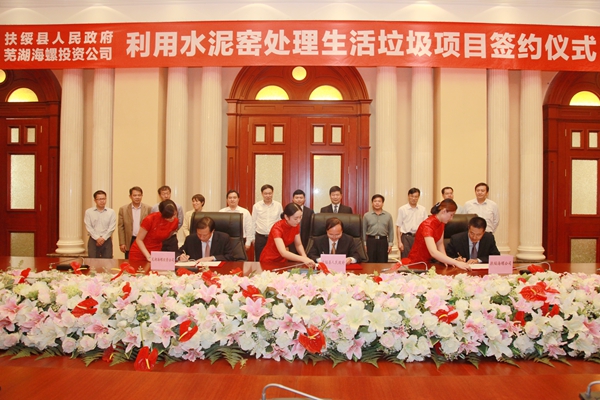 ? ? 2014年10月23日上午,扶綏縣人民政府、海螺創(chuàng )業(yè)公司、扶綏海螺水泥公司在蕪湖海螺國際會(huì )議中心正式簽署了《扶綏縣利用水泥窯處理生活垃圾項目合作協(xié)議》,扶綏縣縣委書(shū)記藍大煌,縣委常委、副縣長(cháng)許家愷;海螺創(chuàng )業(yè)總經(jīng)理紀勤應、戰略企劃部部長(cháng)卜華松;扶綏海螺水泥公司總經(jīng)理萬(wàn)長(cháng)寶等參加了簽約儀式。許家愷、紀勤應、萬(wàn)長(cháng)寶分別代表扶綏縣政府、蕪湖海螺投資公司及扶綏海螺在合作協(xié)議上簽字。