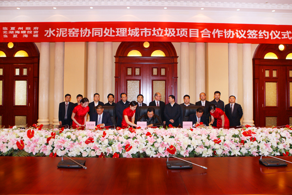 ? ? 在海螺國際會(huì )議中心東海廳舉行了臨夏州利用水泥窯協(xié)同處理城市垃圾合作項目協(xié)議簽字儀式,臨夏州副州長(cháng)魏賀生、海螺創(chuàng )業(yè)總經(jīng)理紀勤應、臨夏海螺董事長(cháng)秦宏基共同簽署協(xié)議。